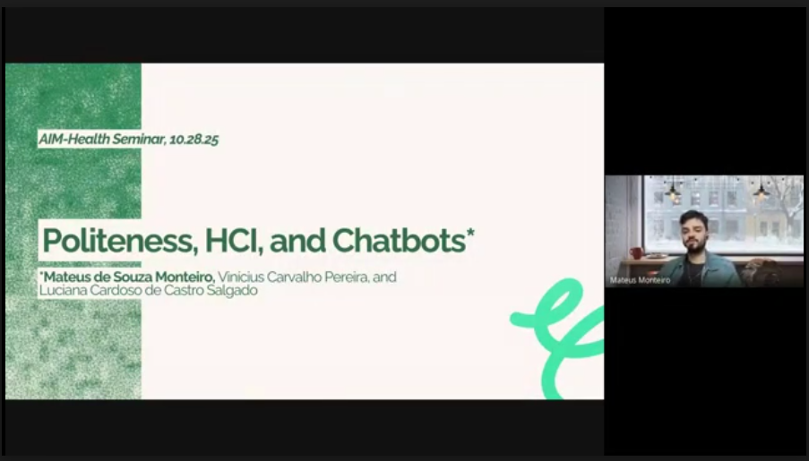This presentation begins with Luciana, who will present ongoing projects from the Semiotic Engineering Research Group at UFF on Computer Education, Human-AI Interaction, and Cultural Issues in HCI. Following her, Vinícius Pereira will discuss key topics from his research group, including Semiotics and Linguistics in HCI, Digital Literature, and Digital Arts, outlining his group’s interdisciplinary approach. Finally, Mateus will present his research on operationalizing politeness using Conversation Analysis and Pragmatics. He will cover the development of a card-based approach, its evaluation, and the key challenges that remain for this research.
